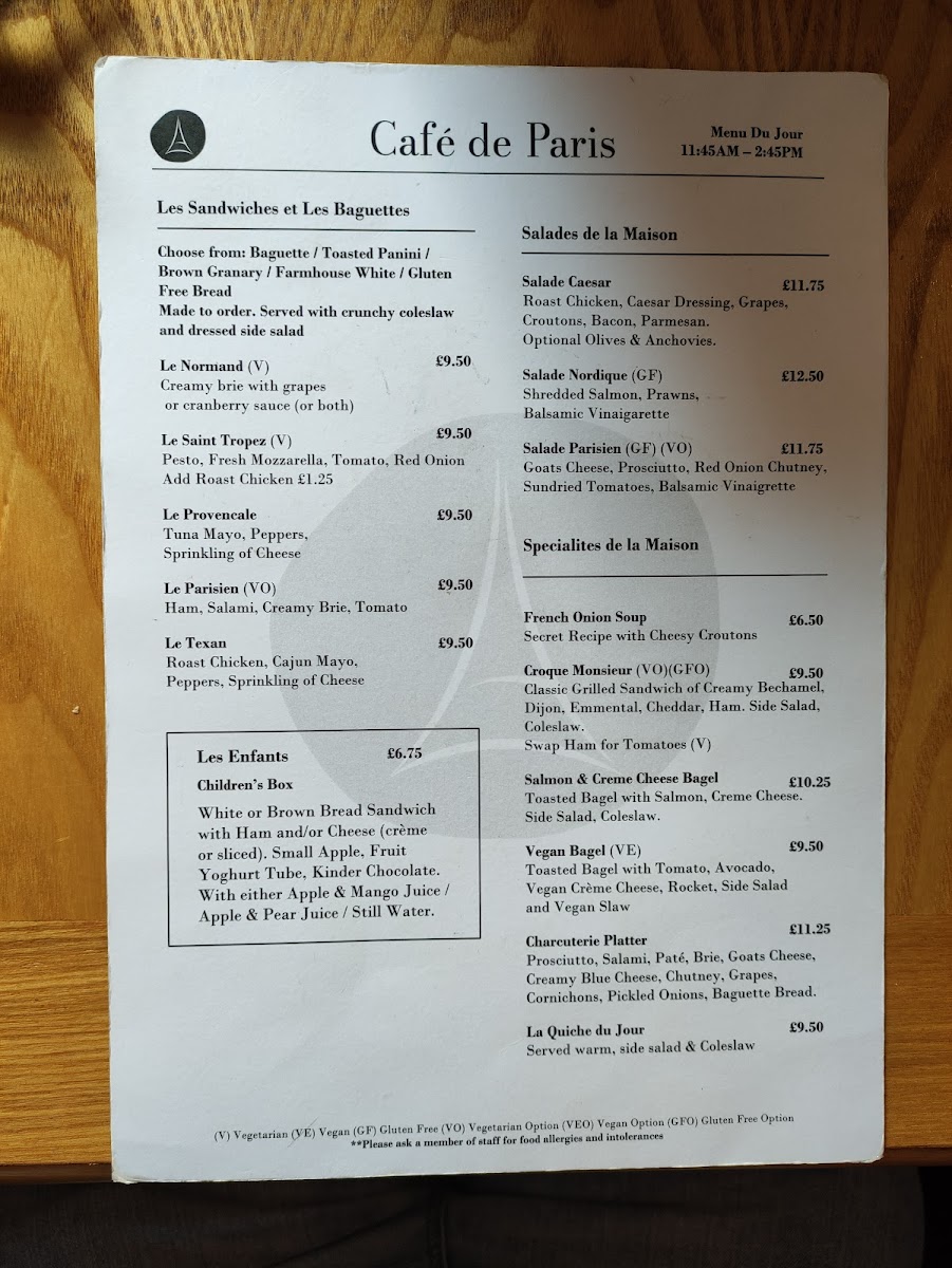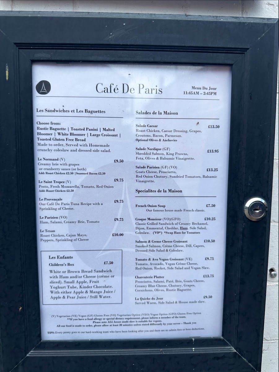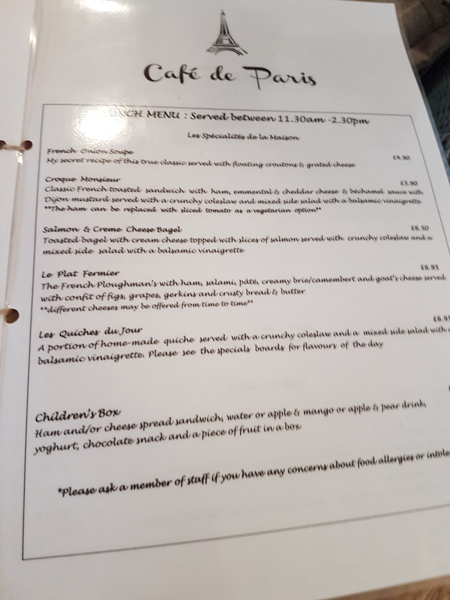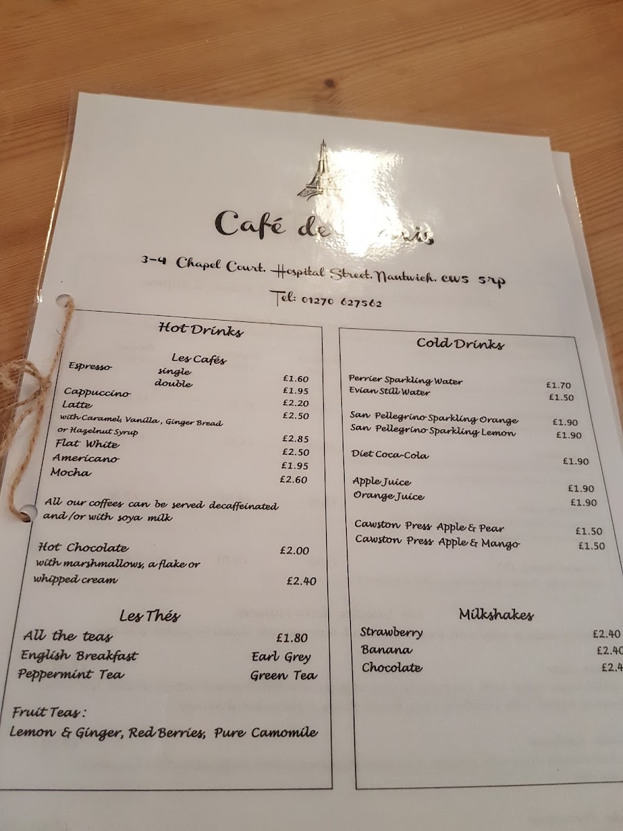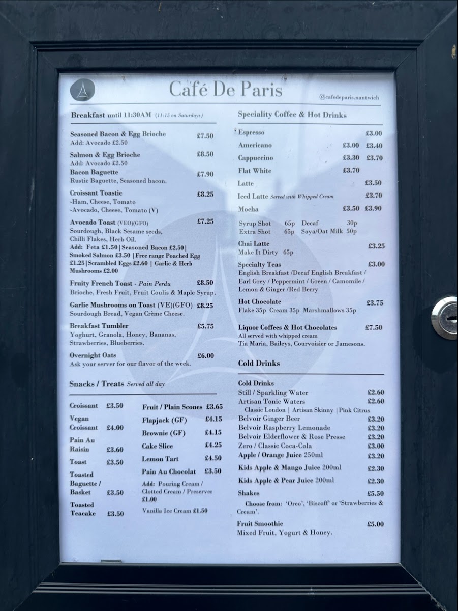 Welcome to Café De Paris, a charming eatery nestled in the heart of Nantwich at 3-4 Chapel Court. This delightful café is not just about great meals; it's an experience of warm hospitality and a cozy atmosphere. Patrons rave about the diverse menu, ranging from indulgent snacks like Cake Slices and delectable Brownies to heartwarming Cold Drinks like Belvoir Elderflower & Rose Presse.